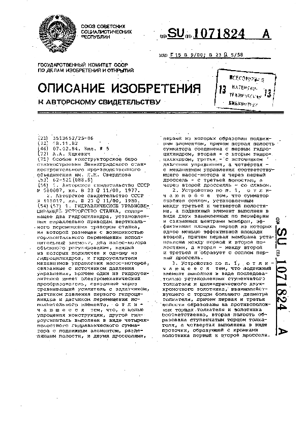 Гидравлическое уравновешивающее устройство станка / Яцкевич А. А.; заявитель: Особое конструкторское бюро станкостроения Ленинградского станкостроительного производственного объединения им. Я. М. Свердлова // Описания изобретений (ретрофонд) / Комитет по патентам и товарным знакам России. – М. — (Патенты России)., 2003. – 1984, № 1. — Загл. с титул. экрана. — Поисковая система: ИПС MIMOSA GTI. — Систем. требования: Acrobat Reader. — Режим доступа: ftp://smolensklib.ru/bd/patent_ru/pt1071824.pdf. — <URL:ftp://smolensklib.ru/bd/patent_ru/pt1071824.pdf>.