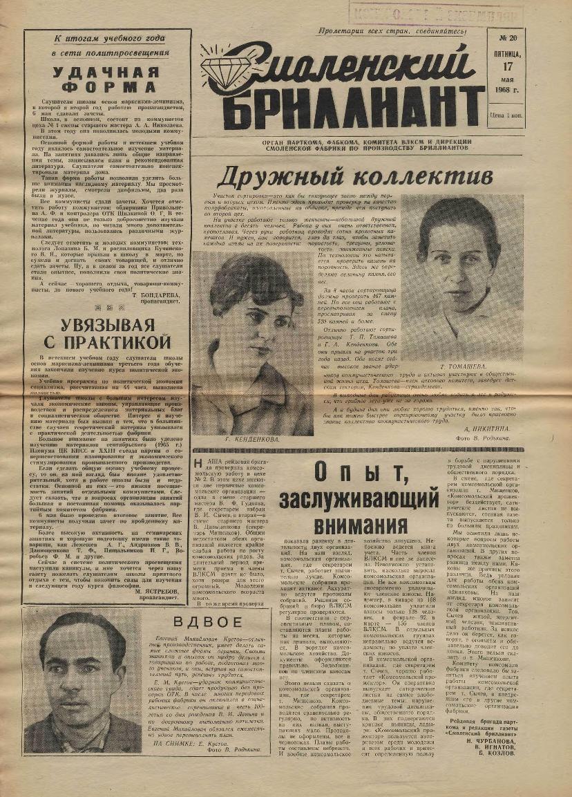 Смоленский бриллиант: Орган парткома, фабкома, комитета ВЛКСМ и дирекции Смоленской фабрики по производству бриллиантов. — Смоленск: Смолгортип., 1968-____. № 20.