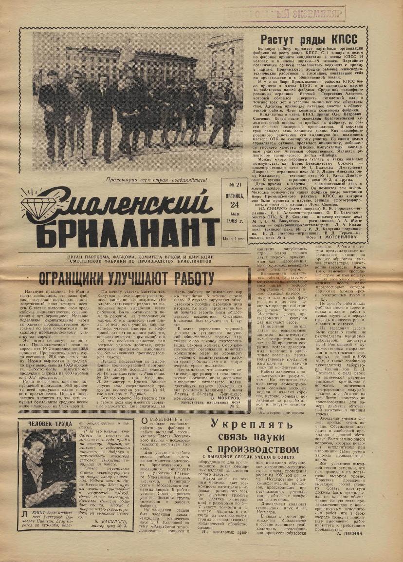 Смоленский бриллиант: Орган парткома, фабкома, комитета ВЛКСМ и дирекции Смоленской фабрики по производству бриллиантов. — Смоленск: Смолгортип., 1968-____. № 21.
