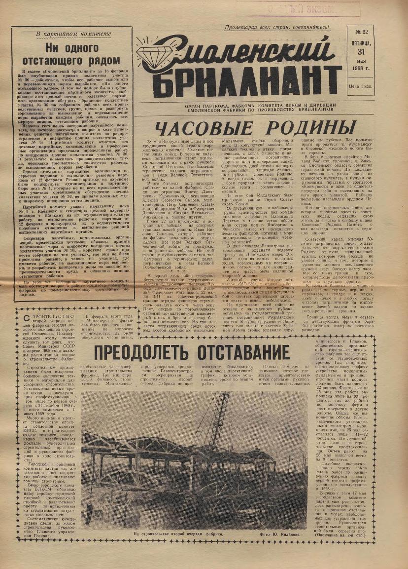 Смоленский бриллиант: Орган парткома, фабкома, комитета ВЛКСМ и дирекции Смоленской фабрики по производству бриллиантов. — Смоленск: Смолгортип., 1968-____. № 22.