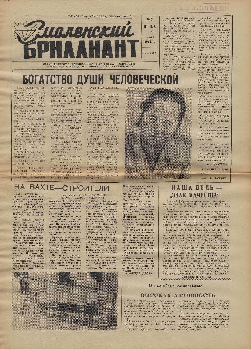 Смоленский бриллиант: Орган парткома, фабкома, комитета ВЛКСМ и дирекции Смоленской фабрики по производству бриллиантов. — Смоленск: Смолгортип., 1968-____. № 23.