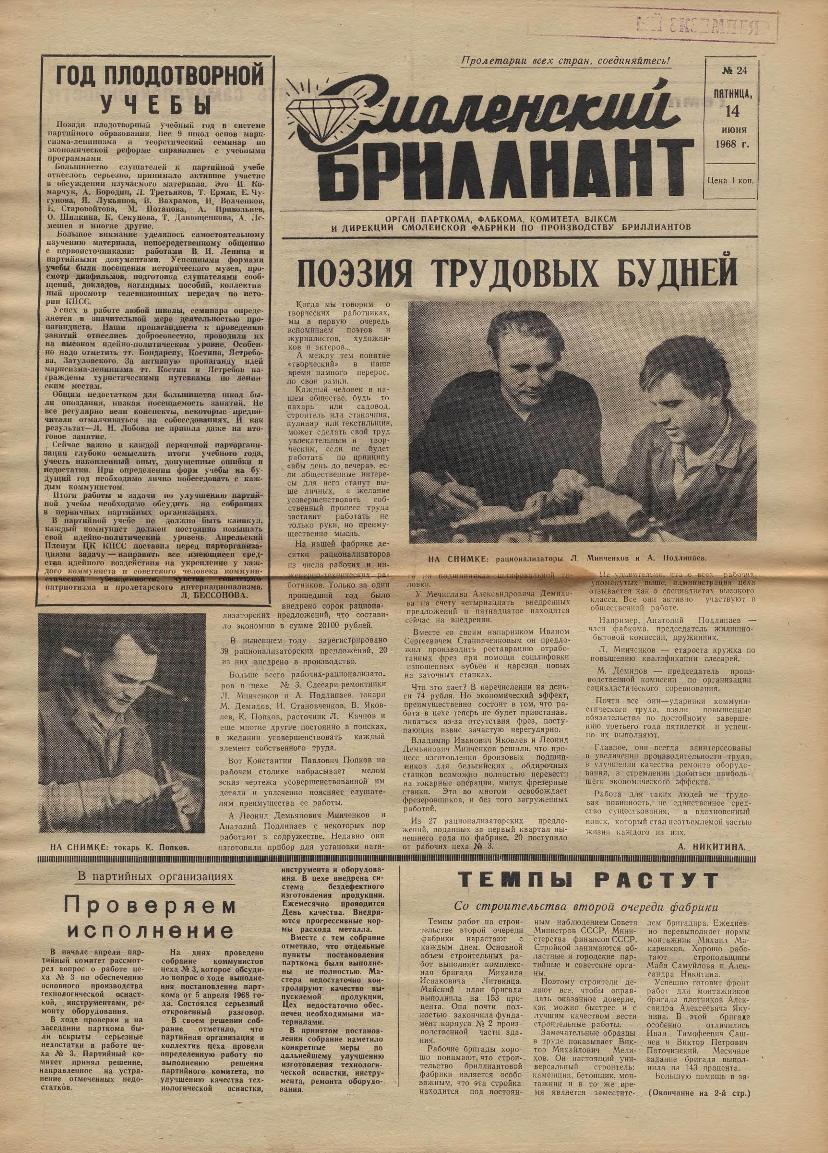 Смоленский бриллиант: Орган парткома, фабкома, комитета ВЛКСМ и дирекции Смоленской фабрики по производству бриллиантов. — Смоленск: Смолгортип., 1968-____. № 24.