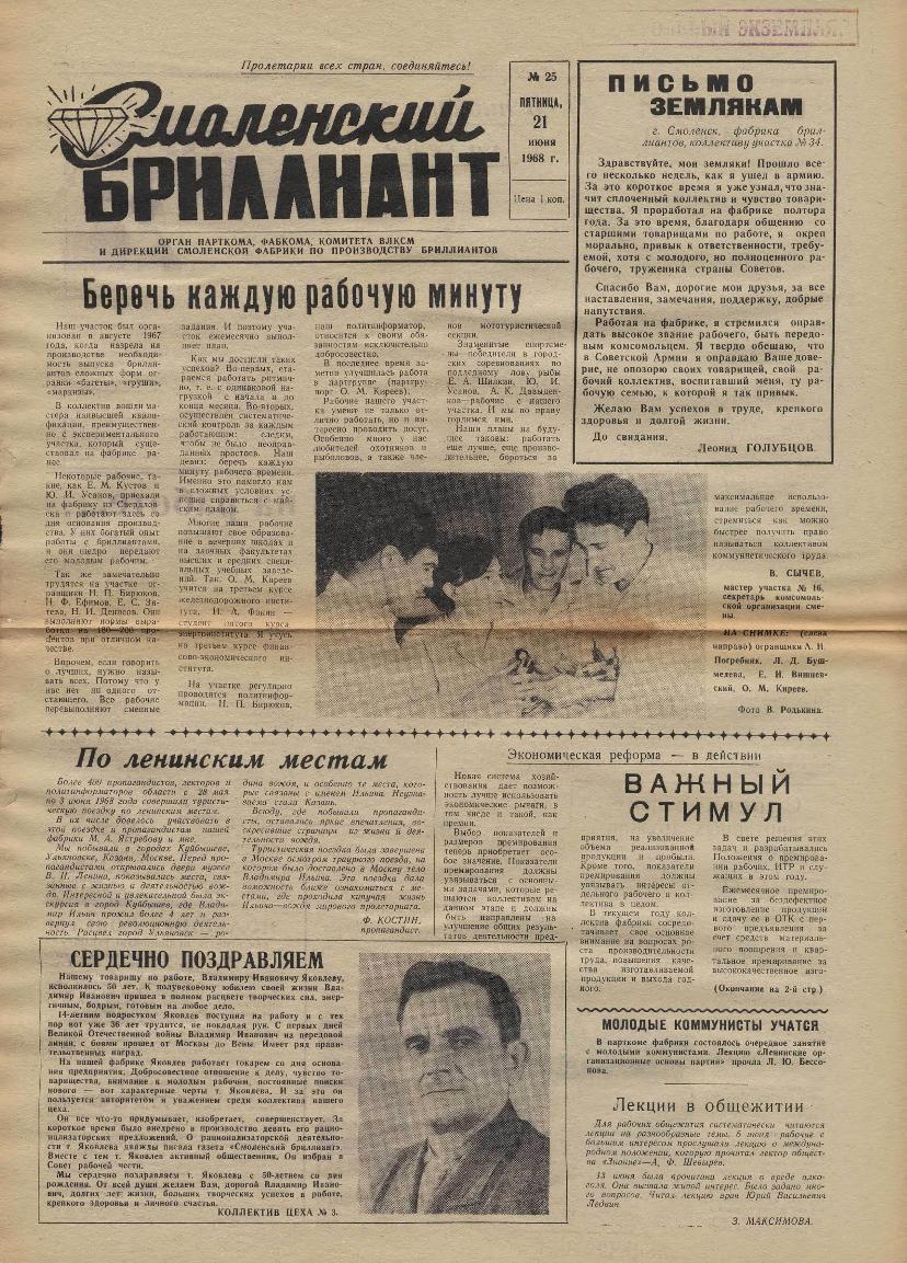 Смоленский бриллиант: Орган парткома, фабкома, комитета ВЛКСМ и дирекции Смоленской фабрики по производству бриллиантов. — Смоленск: Смолгортип., 1968-____. № 25.