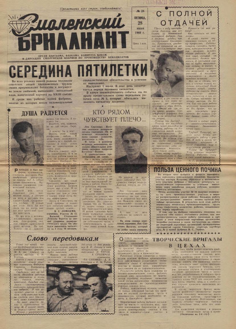 Смоленский бриллиант: Орган парткома, фабкома, комитета ВЛКСМ и дирекции Смоленской фабрики по производству бриллиантов. — Смоленск: Смолгортип., 1968-____. № 26.