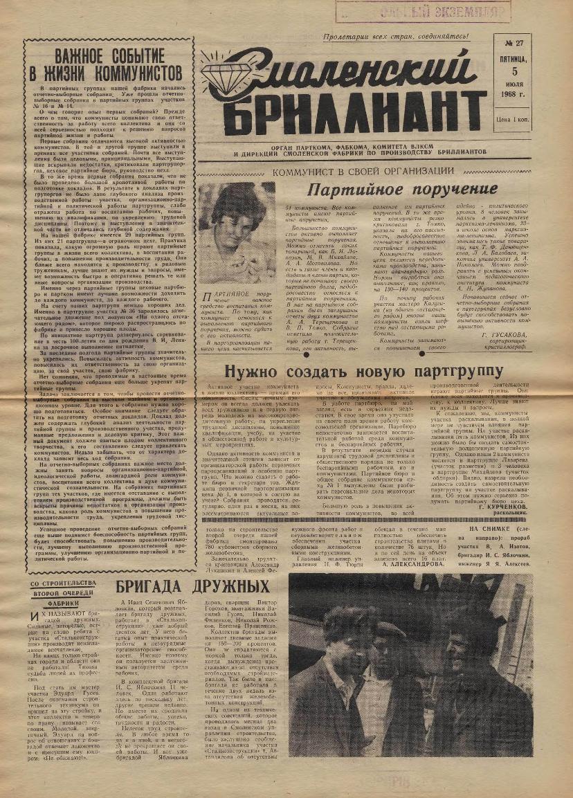 Смоленский бриллиант: Орган парткома, фабкома, комитета ВЛКСМ и дирекции Смоленской фабрики по производству бриллиантов. — Смоленск: Смолгортип., 1968-____. № 27.