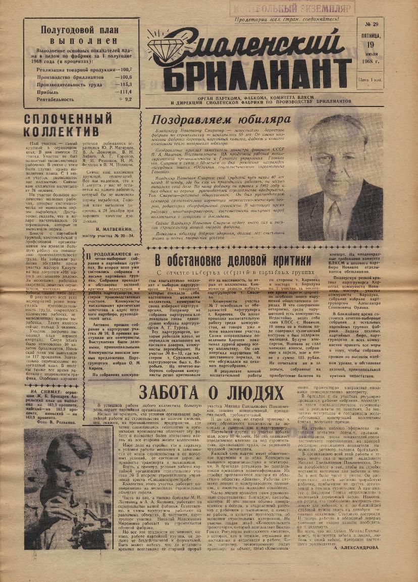Смоленский бриллиант: Орган парткома, фабкома, комитета ВЛКСМ и дирекции Смоленской фабрики по производству бриллиантов. — Смоленск: Смолгортип., 1968-____. № 29.