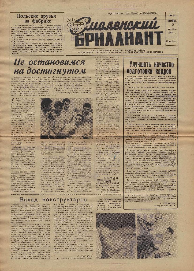 Смоленский бриллиант: Орган парткома, фабкома, комитета ВЛКСМ и дирекции Смоленской фабрики по производству бриллиантов. — Смоленск: Смолгортип., 1968-____. № 31.