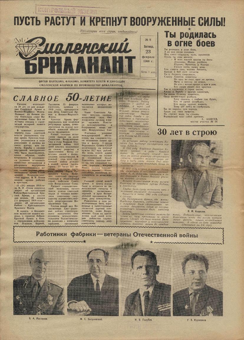 Смоленский бриллиант: Орган парткома, фабкома, комитета ВЛКСМ и дирекции Смоленской фабрики по производству бриллиантов. — Смоленск: Смолгортип., 1968-____. № 8.