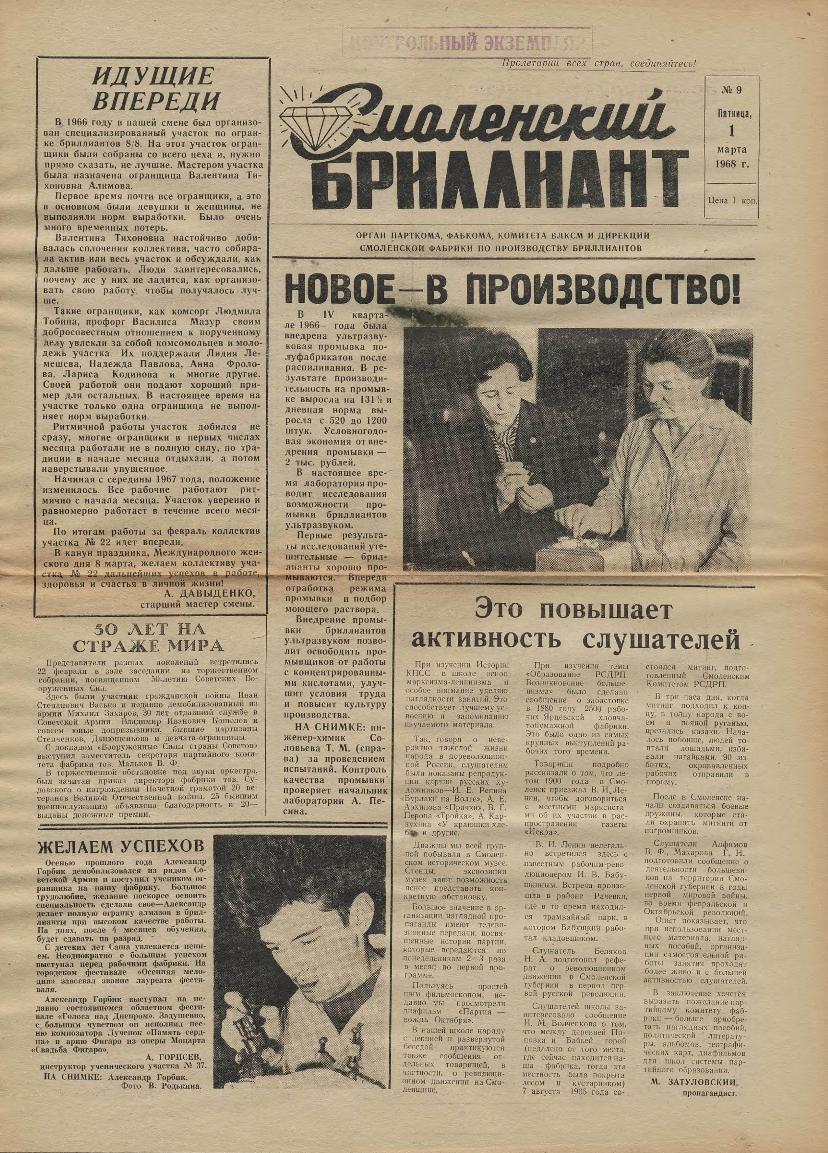 Смоленский бриллиант: Орган парткома, фабкома, комитета ВЛКСМ и дирекции Смоленской фабрики по производству бриллиантов. — Смоленск: Смолгортип., 1968-____. № 9.