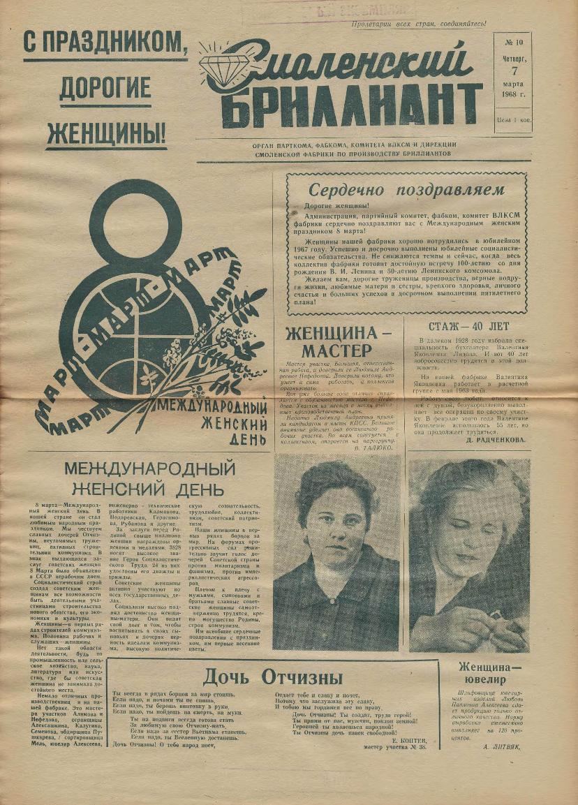 Смоленский бриллиант: Орган парткома, фабкома, комитета ВЛКСМ и дирекции Смоленской фабрики по производству бриллиантов. — Смоленск: Смолгортип., 1968-____. № 10.