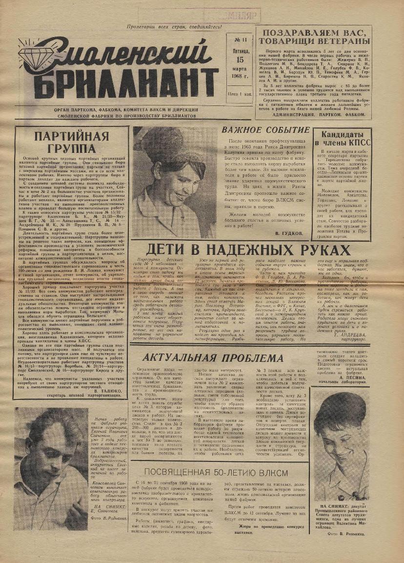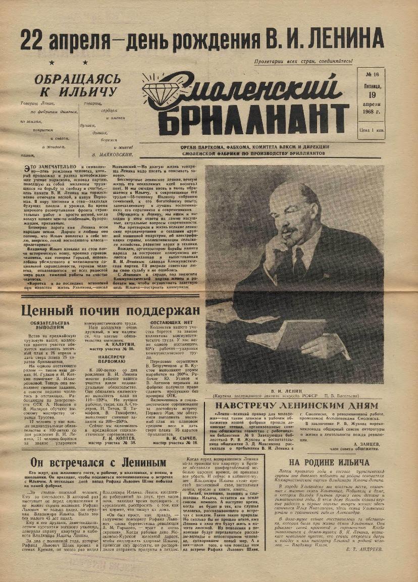 Смоленский бриллиант: Орган парткома, фабкома, комитета ВЛКСМ и дирекции Смоленской фабрики по производству бриллиантов. — Смоленск: Смолгортип., 1968-____. № 16.