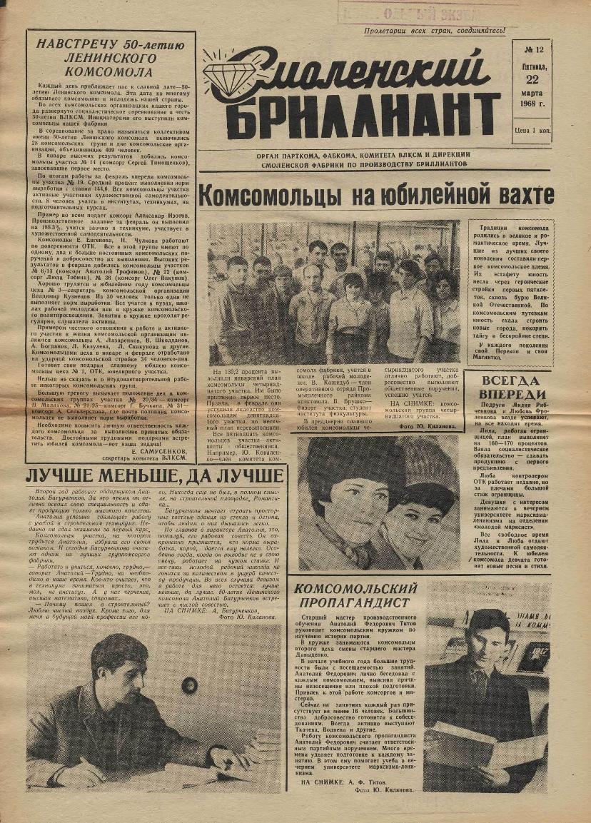 Смоленский бриллиант: Орган парткома, фабкома, комитета ВЛКСМ и дирекции Смоленской фабрики по производству бриллиантов. — Смоленск: Смолгортип., 1968-____. № 12.