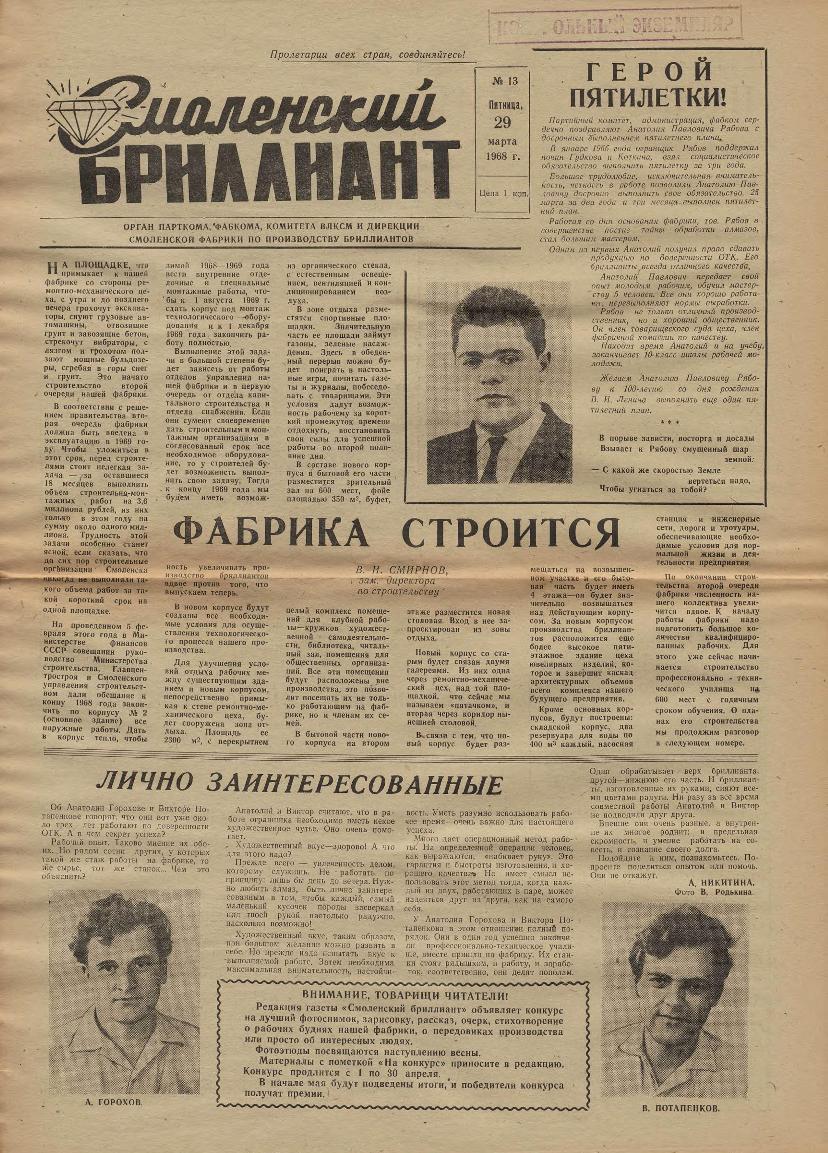 Смоленский бриллиант: Орган парткома, фабкома, комитета ВЛКСМ и дирекции Смоленской фабрики по производству бриллиантов. — Смоленск: Смолгортип., 1968-____. № 13.