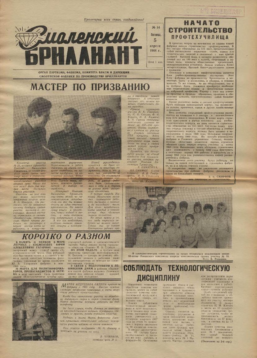Смоленский бриллиант: Орган парткома, фабкома, комитета ВЛКСМ и дирекции Смоленской фабрики по производству бриллиантов. — Смоленск: Смолгортип., 1968-____. № 14.