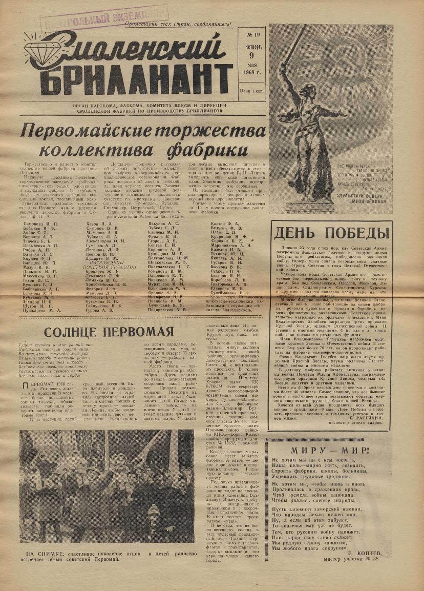 Смоленский бриллиант: Орган парткома, фабкома, комитета ВЛКСМ и дирекции Смоленской фабрики по производству бриллиантов. — Смоленск: Смолгортип., 1968-____. № 19.