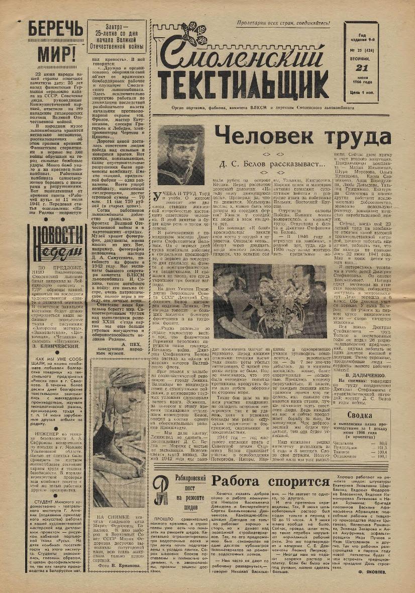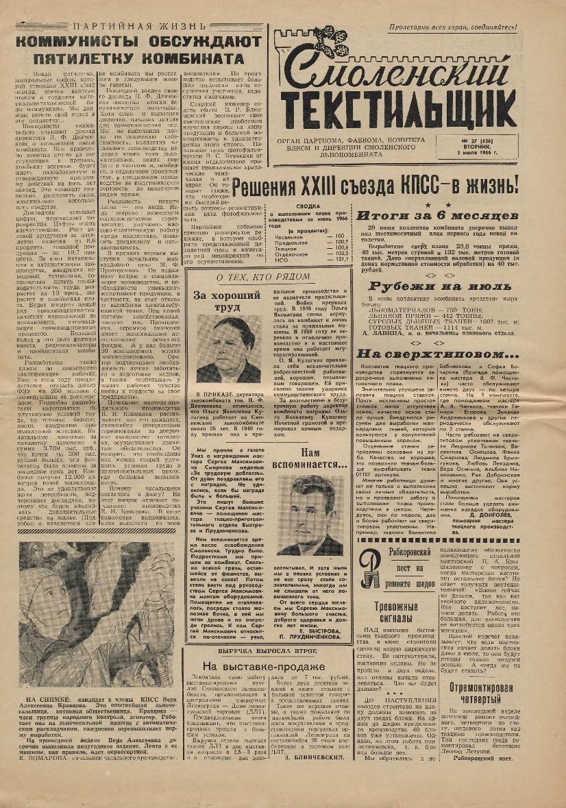 Смоленский текстильщик: Орган парткома, фабкома, комитета ВЛКСМ и дирекции Смоленского льнокомбината. — Смоленск: Тип. им. Смирнова, 1957-____. № 25.