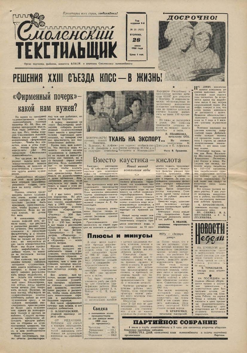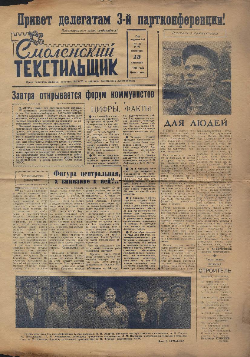 Смоленский текстильщик: Орган парткома, фабкома, комитета ВЛКСМ и дирекции Смоленского льнокомбината. — Смоленск: Тип. им. Смирнова, 1957-____. № 26.