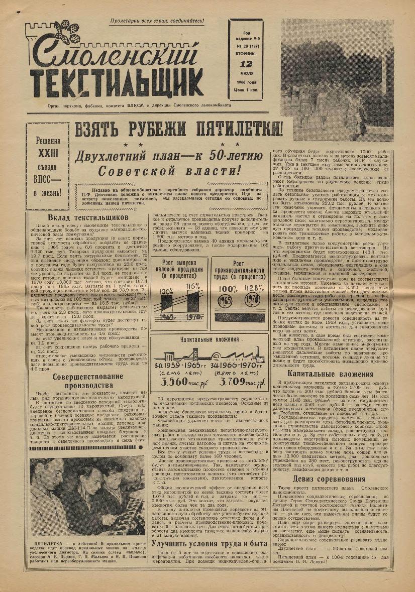 Смоленский текстильщик: Орган парткома, фабкома, комитета ВЛКСМ и дирекции Смоленского льнокомбината. — Смоленск: Тип. им. Смирнова, 1957-____. № 28.