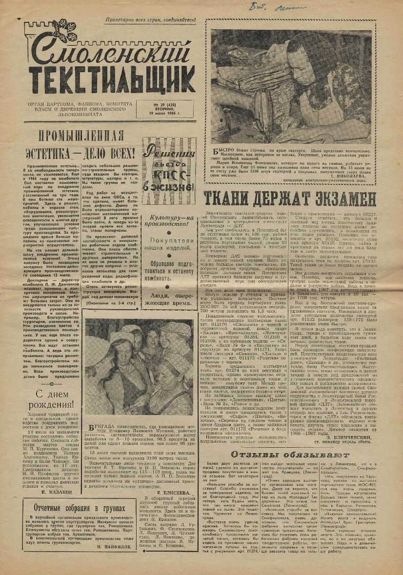Смоленский текстильщик: Орган парткома, фабкома, комитета ВЛКСМ и дирекции Смоленского льнокомбината. — Смоленск: Тип. им. Смирнова, 1957-____. № 29.