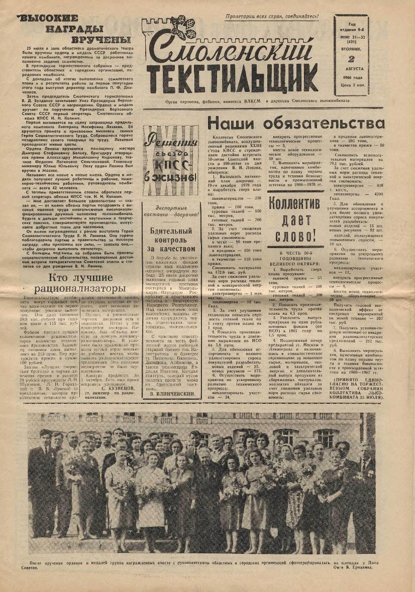 Смоленский текстильщик: Орган парткома, фабкома, комитета ВЛКСМ и дирекции Смоленского льнокомбината. — Смоленск: Тип. им. Смирнова, 1957-____. № 31-32.