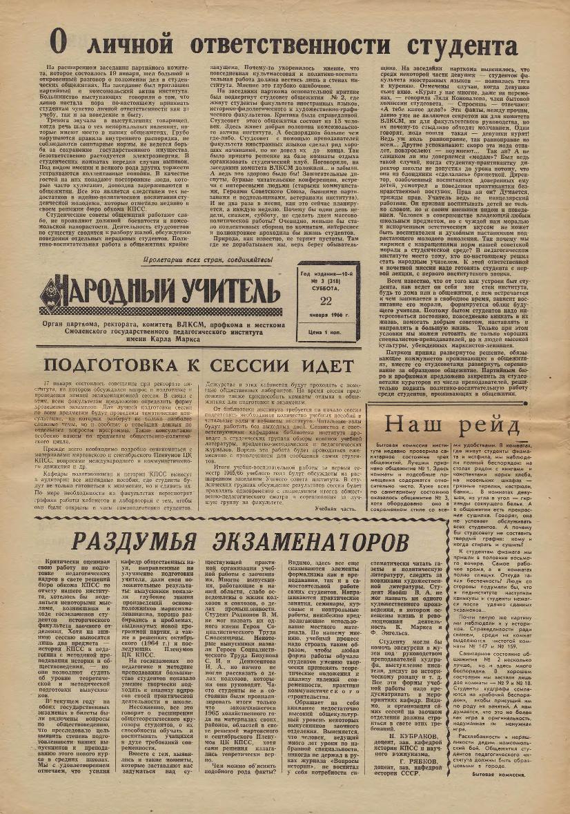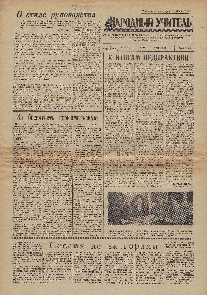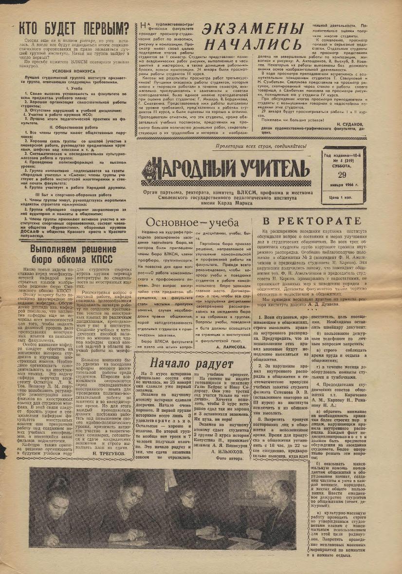 Народный учитель: Орган парткома, ректората, комитета ВЛКСМ, профкома и месткома Смоленского педагогического института имени Карла Маркса. — Смоленск: Тип. им. Смирнова, 1956-____. № 4.