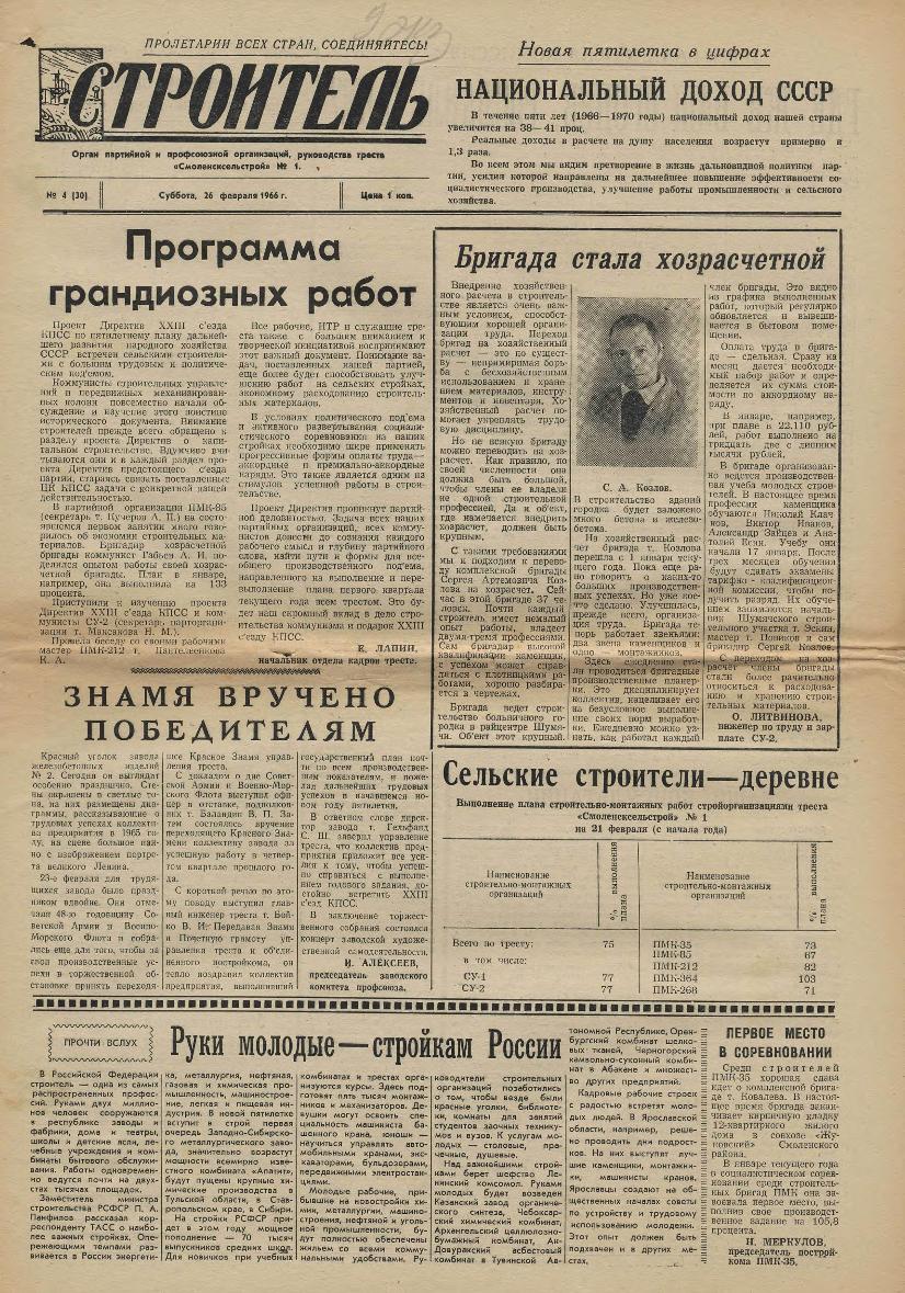 Строитель: Орган партийной и профсоюзной организаций, руководства треста "Смоленсксельстрой" № 1. — Смоленск: Тип. им. Смирнова, 1965-____. № 4.