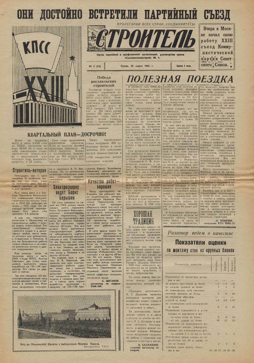 Строитель: Орган партийной и профсоюзной организаций, руководства треста "Смоленсксельстрой" № 1. — Смоленск: Тип. им. Смирнова, 1965-____. № 5.