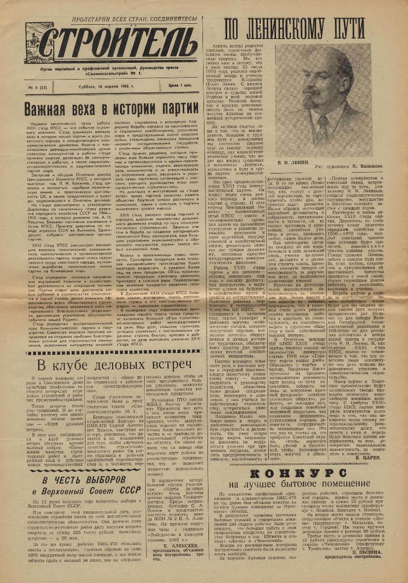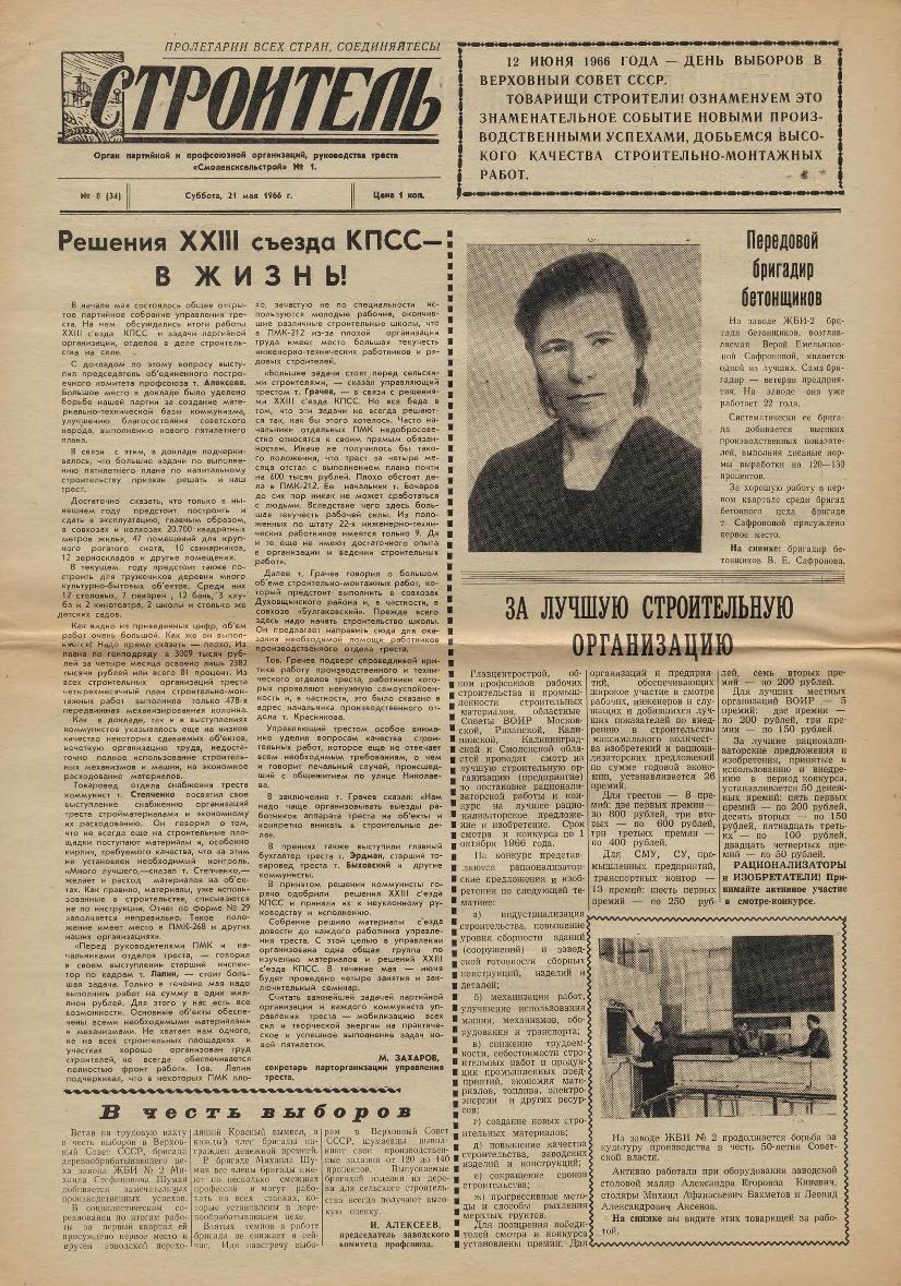Строитель: Орган партийной и профсоюзной организаций, руководства треста "Смоленсксельстрой" № 1. — Смоленск: Тип. им. Смирнова, 1965-____. № 6.