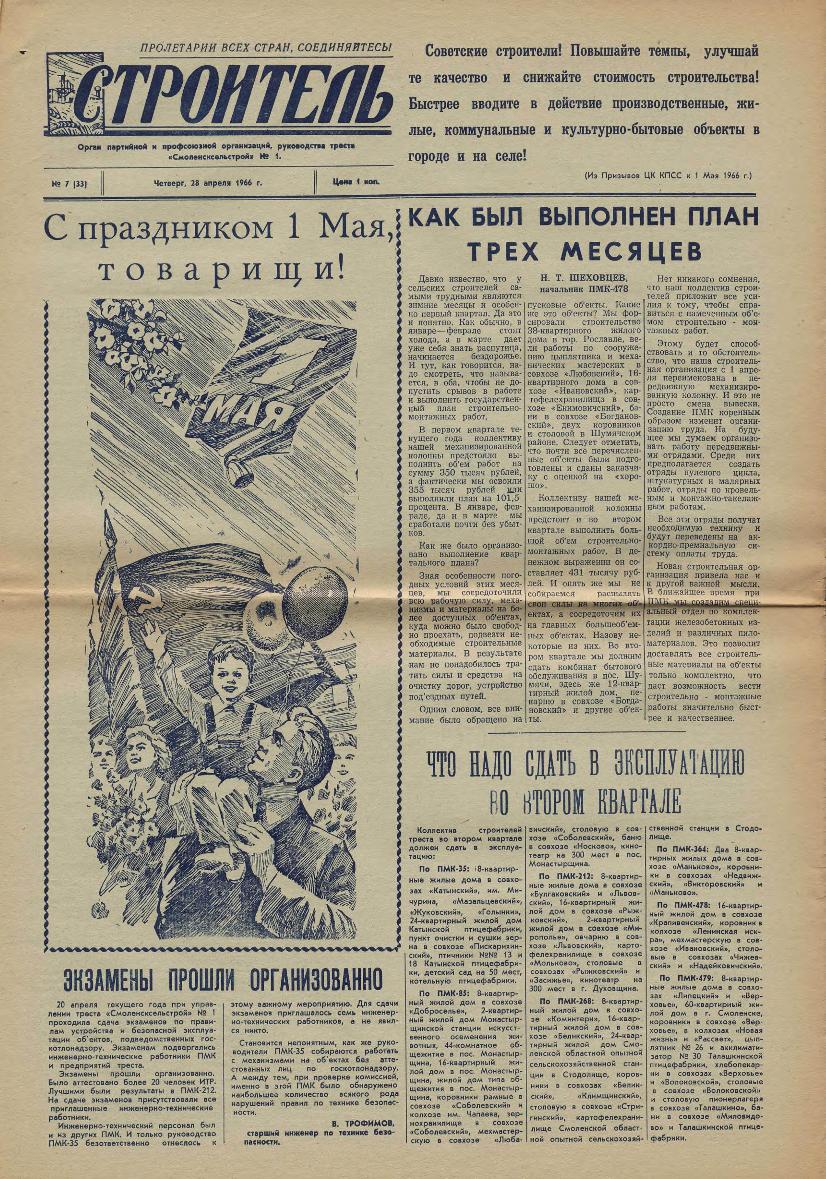 Строитель: Орган партийной и профсоюзной организаций, руководства треста "Смоленсксельстрой" № 1. — Смоленск: Тип. им. Смирнова, 1965-____. № 7.