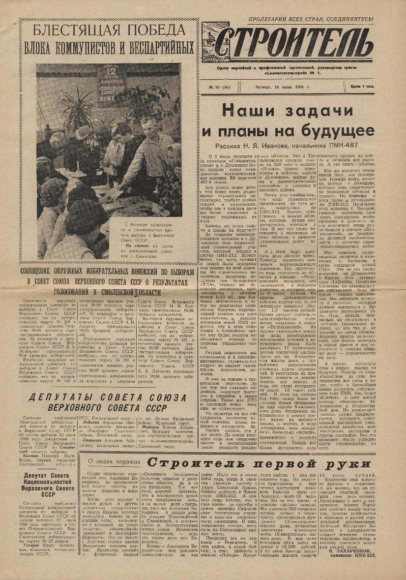 Строитель: Орган партийной и профсоюзной организаций, руководства треста "Смоленсксельстрой" № 1. — Смоленск: Тип. им. Смирнова, 1965-____. № 10.