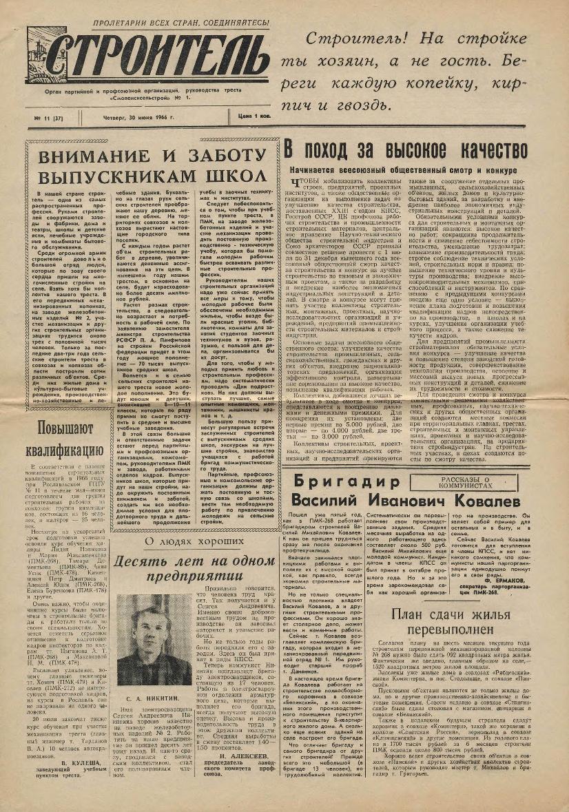 Строитель: Орган партийной и профсоюзной организаций, руководства треста "Смоленсксельстрой" № 1. — Смоленск: Тип. им. Смирнова, 1965-____. № 11.
