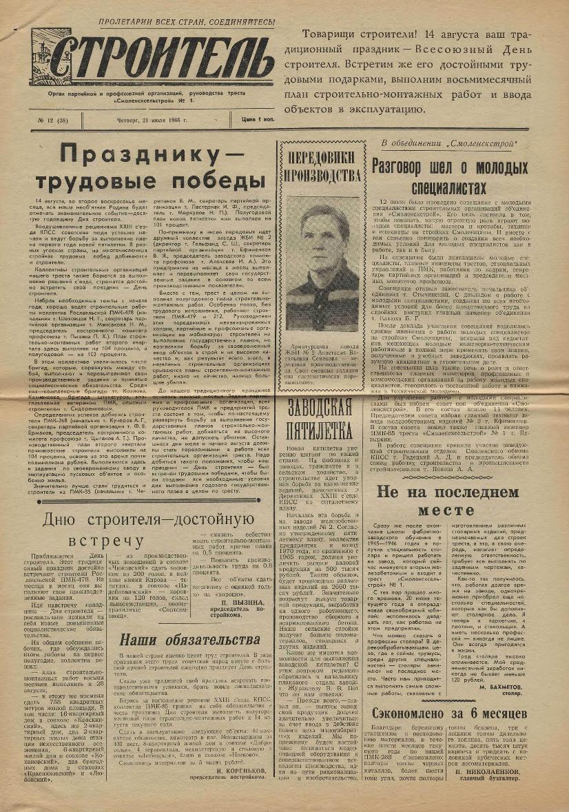 Строитель: Орган партийной и профсоюзной организаций, руководства треста "Смоленсксельстрой" № 1. — Смоленск: Тип. им. Смирнова, 1965-____. № 12.