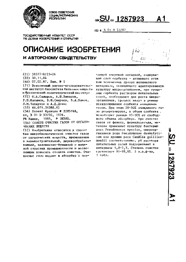Способ очистки газов от органических веществ / Садыров О. А., Винаров А. Ю., Касымов Р. П. [и др.]; заявитель: Всесоюзный научно-исследовательский институт биосинтеза белковых веществ, Фрунзенский политехнический институт // Описания изобретений (ретрофонд) / Комитет по патентам и товарным знакам России. – М., 2003. – 1987, № 1. — (Патенты России). — Загл. с титул. экрана. — Поисковая система: MIMOSA GTI. — Систем. требования: Acrobat Reader. — Режим доступа: ftp://smolensklib.ru/bd/patent_ru/pt1287923.pdf. — <URL:ftp://smolensklib.ru/bd/patent_ru/pt1287923.pdf>.