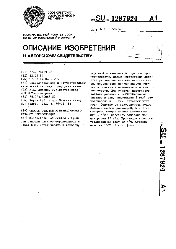 Способ очистки углеводородного газа от сероводорода / Галанин И. А., Шестерикова Р. Е., Толстокорова Л. М.; заявитель: Северо-Кавказский научно-исследовательский институт природных газов // Описания изобретений (ретрофонд) / Комитет по патентам и товарным знакам России. – М., 2003. – 1987, № 1. — (Патенты России). — Загл. с титул. экрана. — Поисковая система: MIMOSA GTI. — Систем. требования: Acrobat Reader. — Режим доступа: ftp://smolensklib.ru/bd/patent_ru/pt1287924.pdf. — <URL:ftp://smolensklib.ru/bd/patent_ru/pt1287924.pdf>.