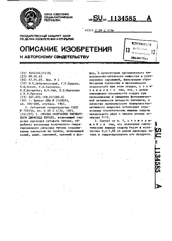 Способ получения пигментного диоксида титана / Добровольский И.П., Пацеля Г.Г., Носач В. Ф. [ и др.] // Описания изобретений (ретрофонд) / Комитет по патентам и товарным знакам России. – М., 2003. – 1985, № 1. — (Патенты России). — Загл. с титул. экрана. — Поисковая система: MIMOSA GTI. — Систем. требования: Acrobat Reader. — Режим доступа: ftp://smolensklib.ru/bd/patent_ru/pt1134585.pdf. — <URL:ftp://smolensklib.ru/bd/patent_ru/pt1134585.pdf>.