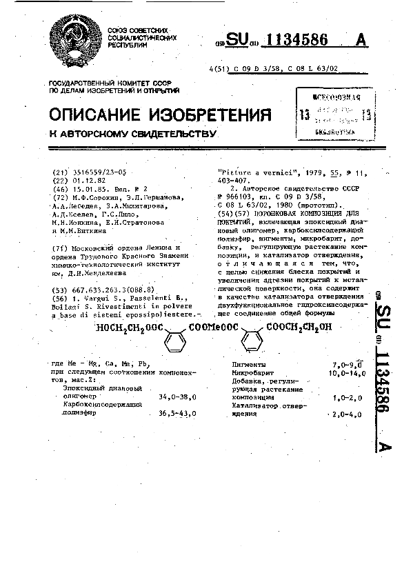 Порошковая композиция для покрытий / Сорокин М. Ф., Гершанова Э. Л., Лебедев А. А. [ и др.]; заявитель: Московский ордена Ленина и ордена Трудового Красного Знамени химико-технологический институт им. Д. И. Менделеева // Описания изобретений (ретрофонд) / Комитет по патентам и товарным знакам России. – М., 2003. – 1985, № 1. — (Патенты России). — Загл. с титул. экрана. — Поисковая система: MIMOSA GTI. — Систем. требования: Acrobat Reader. — Режим доступа: ftp://smolensklib.ru/bd/patent_ru/pt1134586.pdf. — <URL:ftp://smolensklib.ru/bd/patent_ru/pt1134586.pdf>.