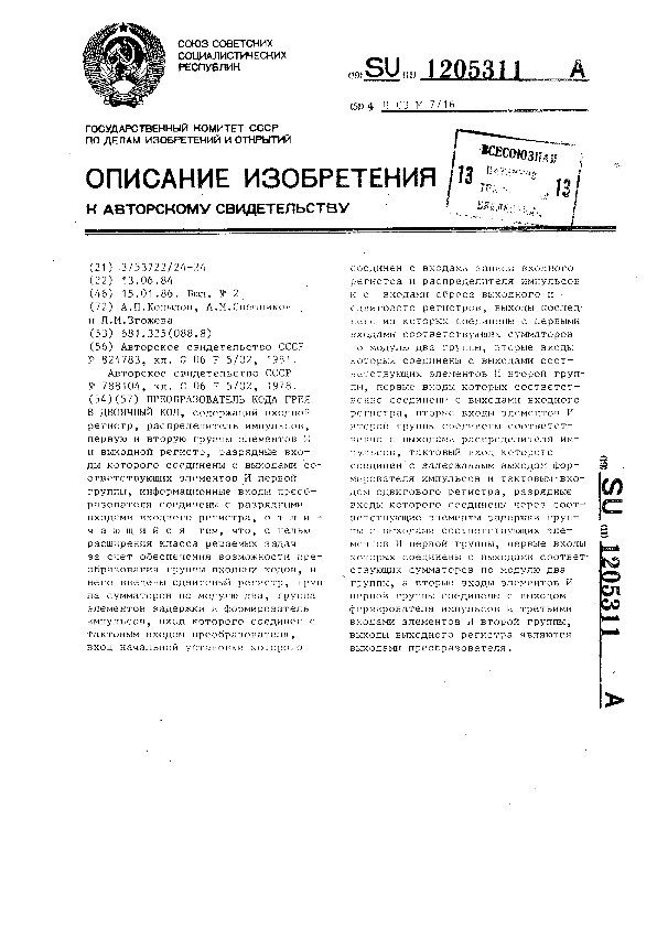 Преобразователь кода Грея в двоичный код / Копылов А. П., Свешников А. М., Згожева Л. М. // Описания изобретений (ретрофонд) / Комитет по патентам и товарным знакам России. – М., 2003. – 1986, № 1. — (Патенты России). — Загл. с титул. экрана. — Поисковая система: ИПС MIMOSA GTI. — Систем. требования: Acrobat Reader. — Режим доступа: ftp://smolensklib.ru/bd/patent_ru/pt1205311.pdf. — <URL:ftp://smolensklib.ru/bd/patent_ru/pt1205311.pdf>.