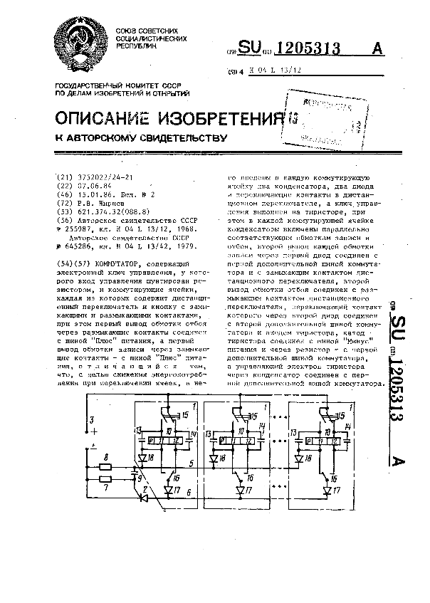 Коммутатор / Жирнов Р. В. // Описания изобретений (ретрофонд) / Комитет по патентам и товарным знакам России. – М., 2003. – 1986, № 1. — (Патенты России). — Загл. с титул. экрана. — Поисковая система: ИПС MIMOSA GTI. — Систем. требования: Acrobat Reader. — Режим доступа: ftp://smolensklib.ru/bd/patent_ru/pt1205313.pdf. — <URL:ftp://smolensklib.ru/bd/patent_ru/pt1205313.pdf>.