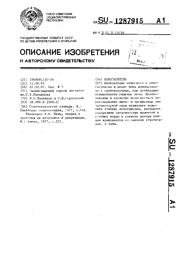 Пеногаситель / Брыляков Ю. Е., Горловский С. И.; заявитель: Ленинградский горный институт им. Г. В. Плеханова // Описания изобретений (ретрофонд) / Комитет по патентам и товарным знакам России. – М., 2003. – 1987, № 1. — (Патенты России). — Загл. с титул. экрана. — Поисковая система: MIMOSA GTI. — Систем. требования: Acrobat Reader. — Режим доступа: ftp://smolensklib.ru/bd/patent_ru/pt1287915.pdf. — <URL:ftp://smolensklib.ru/bd/patent_ru/pt1287915.pdf>.