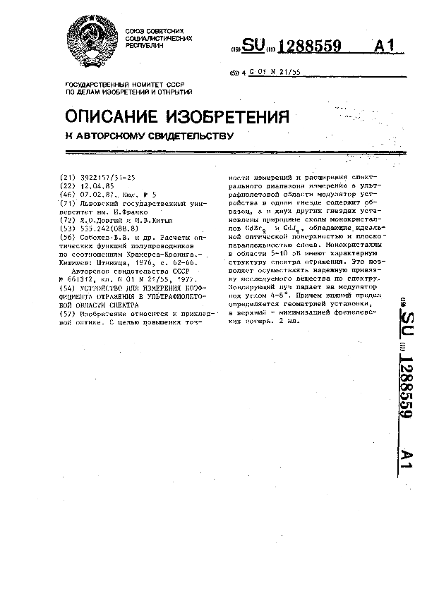 Устройство для измерения коэффициента отражения в ультрафиолетовой области спектра / Довгий Я. О., Китык И. В.; заявитель: Львовский государственный университет им. И. Франко // Описания изобретений (ретрофонд) / Комитет по патентам и товарным знакам России. – М., 2003. – 1987, № 1. — (Патенты России). — Загл. с титул. экрана. — Поисковая система: MIMOSA GTI. — Систем. требования: Acrobat Reader. — Режим доступа: ftp://smolensklib.ru/bd/patent_ru/pt1288559.pdf. — <URL:ftp://smolensklib.ru/bd/patent_ru/pt1288559.pdf>.