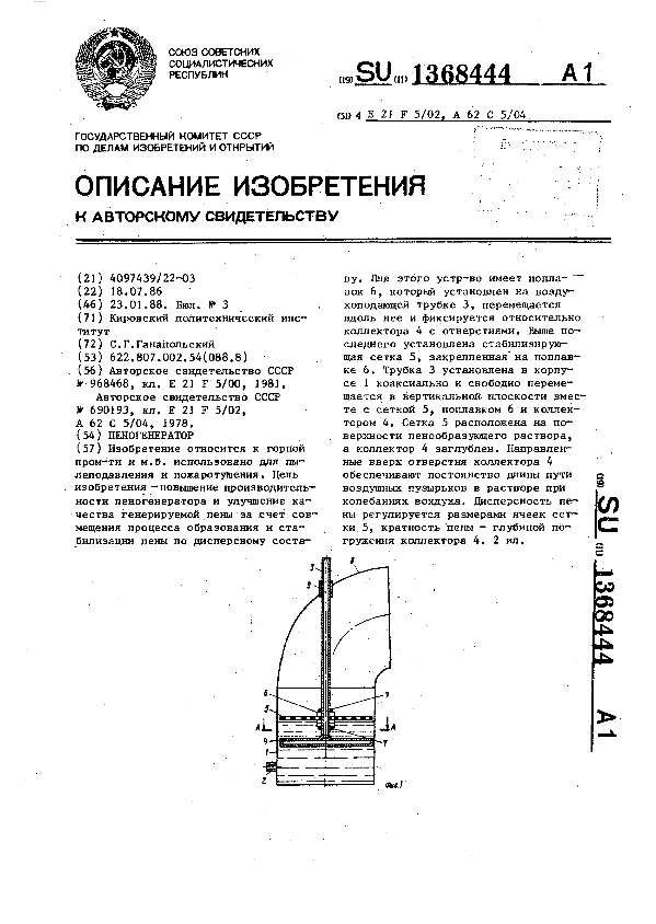 Пеногенератор / Ганапольский С. Г.; заявитель: Кировский политехнический институт // Описания изобретений (ретрофонд) / Комитет по патентам и товарным знакам России. — М., 1994-____. — (Патенты России). – 1988, № 1. — Загл. с титул. экрана. — Поисковая система: ИПС MIMOSA GTI. — Систем. требования: Acrobat Reader. — Режим доступа: ftp://smolensklib.ru/bd/patent_ru/pt1368444.pdf. — <URL:ftp://smolensklib.ru/bd/patent_ru/pt1368444.pdf>.
