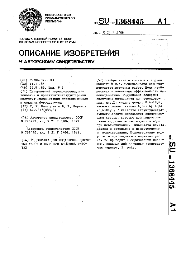 Гидропаста для подавления ядовитых газов и пыли при взрывных работах / Жильцова Т. К., Лариков В. Т.; заявитель: Центральный научно-исследовательский и проектно-конструкторский институт профилактики пневмокониозов и техники безопасности // Описания изобретений (ретрофонд) / Комитет по патентам и товарным знакам России. — М., 1994-____. — (Патенты России). – 1988, № 1. — Загл. с титул. экрана. — Поисковая система: ИПС MIMOSA GTI. — Систем. требования: Acrobat Reader. — Режим доступа: ftp://smolensklib.ru/bd/patent_ru/pt1368445.pdf. — <URL:ftp://smolensklib.ru/bd/patent_ru/pt1368445.pdf>.