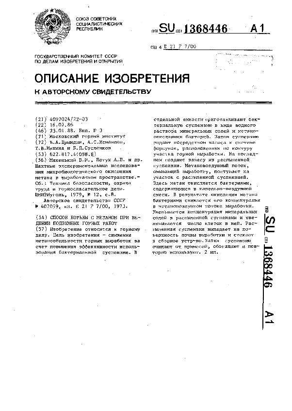 Способ борьбы с метаном при ведении подземных горных работ / Дрындин В. А., Исмаилов А. С., Михина Т. В., Сусленков Б. Д.; заявитель: Московский горный институт // Описания изобретений (ретрофонд) / Комитет по патентам и товарным знакам России. — М., 1994-____. — (Патенты России). – 1988, № 1. — Загл. с титул. экрана. — Поисковая система: ИПС MIMOSA GTI. — Систем. требования: Acrobat Reader. — Режим доступа: ftp://smolensklib.ru/bd/patent_ru/pt1368446.pdf. — <URL:ftp://smolensklib.ru/bd/patent_ru/pt1368446.pdf>.
