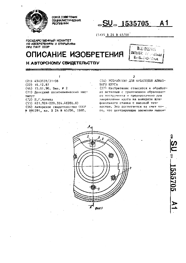Устройство для крепления алмазного круга / Матюха П. Г.; заявитель: Донецкий политехнический институт // Описания изобретений (ретрофонд) / Комитет по патентам и товарным знакам России. – М., 2003. – 1990, № 1. — (Патенты России). — Загл. с титул. экрана. — Поисковая система: MIMOSA GTI. — Систем. требования: Acrobat Reader. — Режим доступа: ftp://smolensklib.ru/bd/patent_ru/pt1535705.pdf. — <URL:ftp://smolensklib.ru/bd/patent_ru/pt1535705.pdf>.