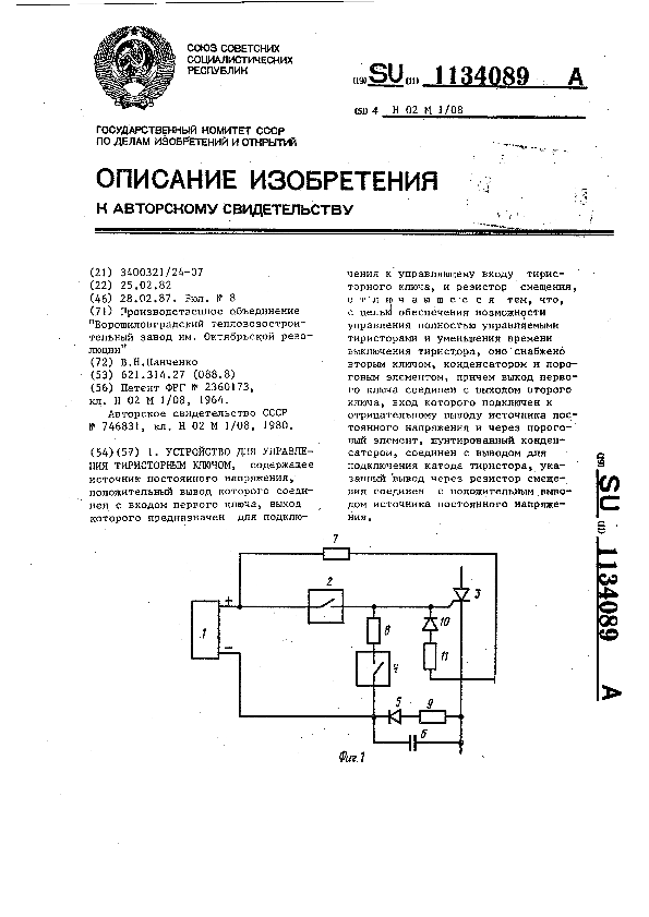 Устройство для управления тиристорным ключом / Панченко В.Н.; заявитель: Производственное объединение "Ворошиловградский тепловозостроительный завод им. Октябрьской революции" // Описания изобретений (ретрофонд) / Комитет по патентам и товарным знакам России. – М., 2003. – 1985, № 1 — 1 файл: 397 Кб: ил. — (Патенты России). — Загл. с титул. экрана. — Поисковая система: MIMOSA GTI. — Систем. требования: Acrobat Reader. — Режим доступа: ftp://smolensklib.ru/bd/patent_ru/pt1134089.pdf. — <URL:ftp://smolensklib.ru/bd/patent_ru/pt1134089.pdf>.
