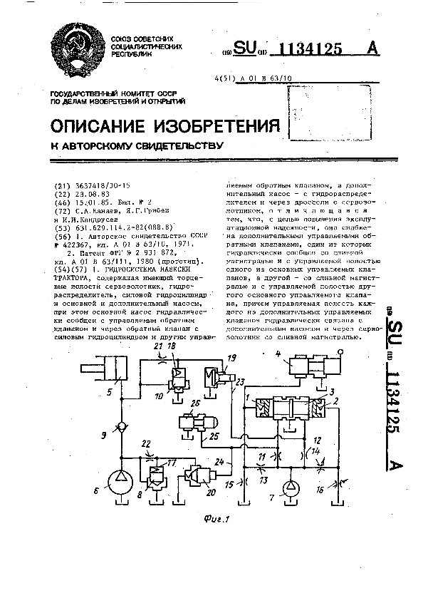 Гидросистема навески трактора / Канаев С.А., Грибец Я.Г., Кандрусев И.И. // Описания изобретений (ретрофонд) / Комитет по патентам и товарным знакам России. – М., 2003. – 1985, № 1 — 1 файл: 237 Кб: ил. — (Патенты России). — Загл. с титул. экрана. — Поисковая система: MIMOSA GTI. — Систем. требования: Acrobat Reader. — Режим доступа: ftp://smolensklib.ru/bd/patent_ru/pt1134125.pdf. — <URL:ftp://smolensklib.ru/bd/patent_ru/pt1134125.pdf>.