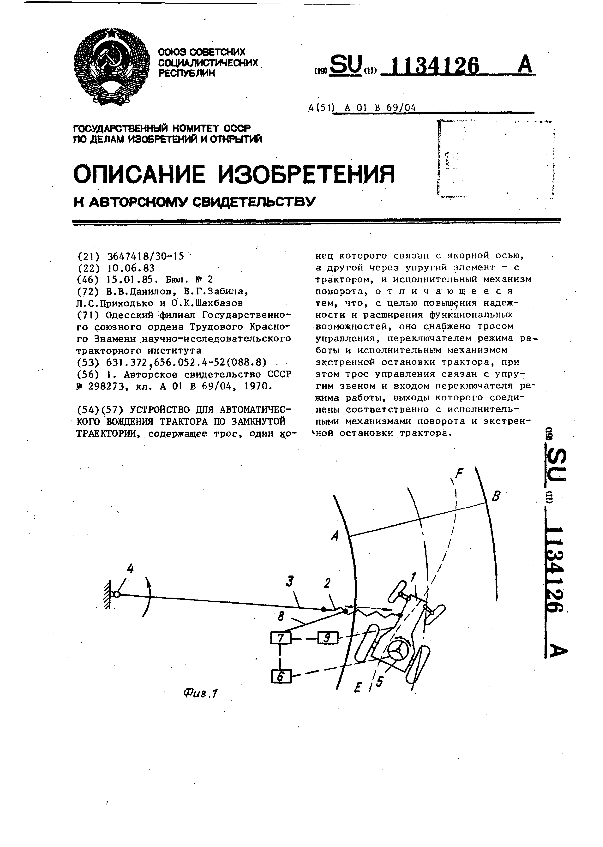 Устройство для автоматического вождения трактора по замкнутой траектории / Данилов В.В., Забила В.Г., Приходько Л.С., Шахбазов О.К.; заявитель: Одесский филиал Государственного союзного ордена Трудового Красного Знамени научно-исследовательского тракторного института // Описания изобретений (ретрофонд) / Комитет по патентам и товарным знакам России. – М., 2003. – 1985, № 1 — 1 файл: 165 Кб: ил. — (Патенты России). — Загл. с титул. экрана. — Поисковая система: MIMOSA GTI. — Систем. требования: Acrobat Reader. — Режим доступа: ftp://smolensklib.ru/bd/patent_ru/pt1134126.pdf. — <URL:ftp://smolensklib.ru/bd/patent_ru/pt1134126.pdf>.