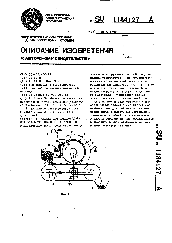 Машина дня предпосадочной обработки клубней картофеля в электрическом поле / Шмигель В.Н., Григорьев В.Г.; заявитель: Ижевский сельскохозяйственный институт // Описания изобретений (ретрофонд) / Комитет по патентам и товарным знакам России. – М., 2003. – 1985, № 1 — 1 файл: 238 Кб: ил. — (Патенты России). — Загл. с титул. экрана. — Поисковая система: MIMOSA GTI. — Систем. требования: Acrobat Reader. — Режим доступа: ftp://smolensklib.ru/bd/patent_ru/pt1134127.pdf. — <URL:ftp://smolensklib.ru/bd/patent_ru/pt1134127.pdf>.