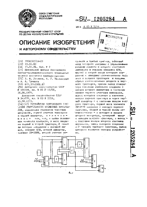 Устройство допускового контроля длительности временных интервалов / Данилов В. В., Запольский А. Г., Чумаков А. А.; заявитель: Пензенский филиал Всесоюзного научно-исследовательского технологического института приборостроения // Описания изобретений (ретрофонд) / Комитет по патентам и товарным знакам России. – М., 2003. – 1986, № 1. — (Патенты России). — Загл. с титул. экрана. — Поисковая система: ИПС MIMOSA GTI. — Систем. требования: Acrobat Reader. — Режим доступа: ftp://smolensklib.ru/bd/patent_ru/pt1205284.pdf. — <URL:ftp://smolensklib.ru/bd/patent_ru/pt1205284.pdf>.