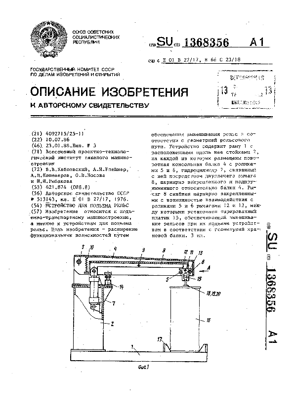 Устройство для подъема рельс / Хабловский В. В., Клейнер А. И., Кошеверов А. Д. [и др.]; заявитель: Всесоюзный проектно-технологический институт тяжелого машиностроения // Описания изобретений (ретрофонд) / Комитет по патентам и товарным знакам России. — М., 1994-____. — (Патенты России). – 1988, № 1. — Загл. с титул. экрана. — Поисковая система: ИПС MIMOSA GTI. — Систем. требования: Acrobat Reader. — Режим доступа: ftp://smolensklib.ru/bd/patent_ru/pt1368356.pdf. — <URL:ftp://smolensklib.ru/bd/patent_ru/pt1368356.pdf>.